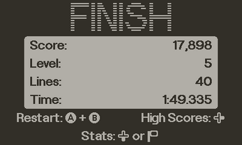Each game mode has its own high score table that will save the top 25 scores (fastest 25 times in 40 Lines mode).